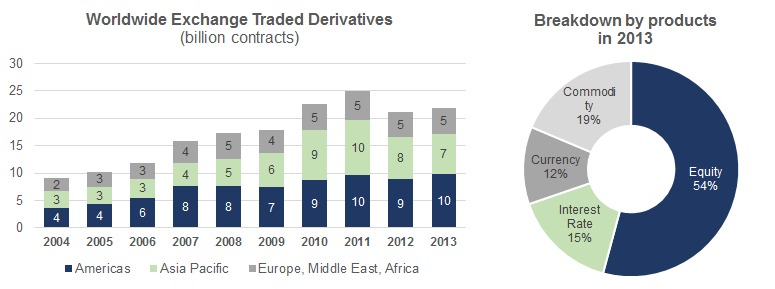 Excluding Kospi 200 options, the highest increase in exchange traded derivatives volume in 2013 was observed in Asia Pacific region (+13.2%), followed by Americas (+9.7%) and Europe, Africa, and Middle East (+0.5%).