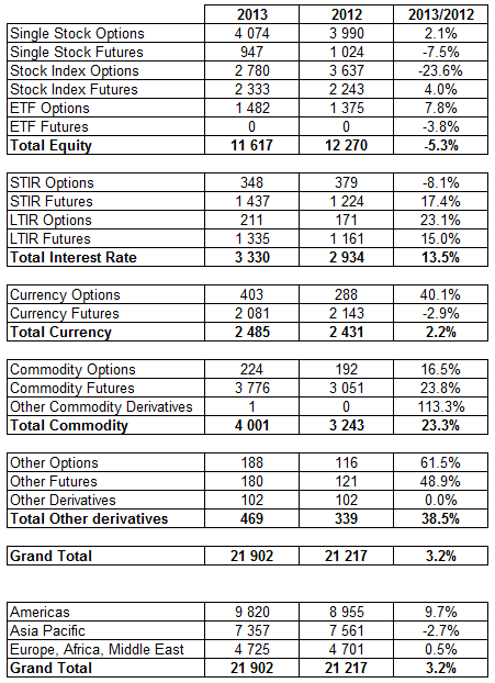 Equity derivatives: The drop in equity derivatives (-5.3%) is mainly explained by the size changing of the KRX (Korea Exchange) KOSPI 200 contracts, the weight of which is very significant. The overall 2013 equity derivatives volume increased by 3.2% when those contracts are excluded from the statistics.