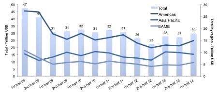 - A continuing strong performance of equity markets, Global Market Capitalization rose 6% to 68.7 trillion USD from the second-half of 2013 (+21% year on year.)