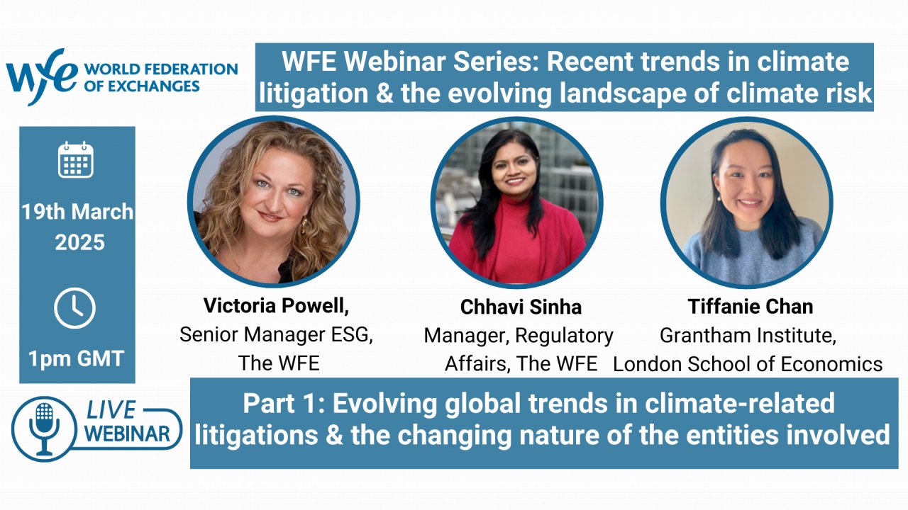 Summary: Tiffanie Chan will be providing an overview of the rising climate litigation cases globally, covering the meaning and types of climate linked litigation and the evolving legal arguments and the changing nature of entities involved. The presentation and the discussion with Tiffanie, Victoria and Chhavi aims at creating awareness of the evolving trends in climate litigation to enable stock exchanges and FMIs to make strategic and investment decisions aligned with ESG principles.